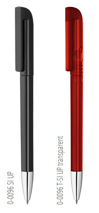 0-0096 SI: Drehkugelschreiber mit gedeckt glänzendem Gehäuse, matter Clipoberfläche und glanzverchromter Spitze. 0-0096 T-SI: Drehkugelschreiber mit transparent glänzendem Gehäuse, gefrosteter Clipoberfläche und glanzverchromter Spitze. Mindestbestellmenge: 1.000 Stk.